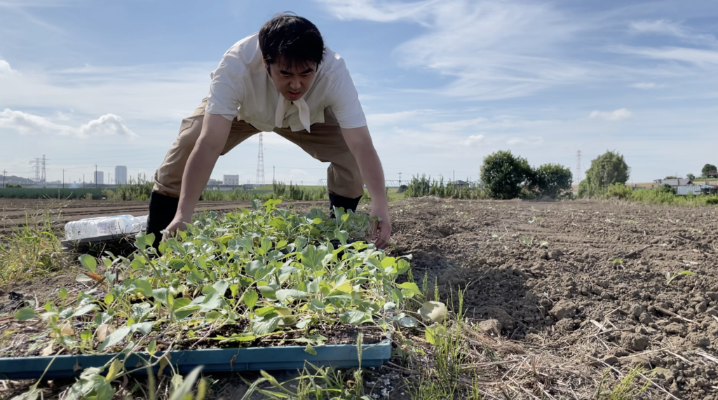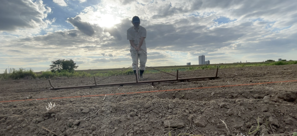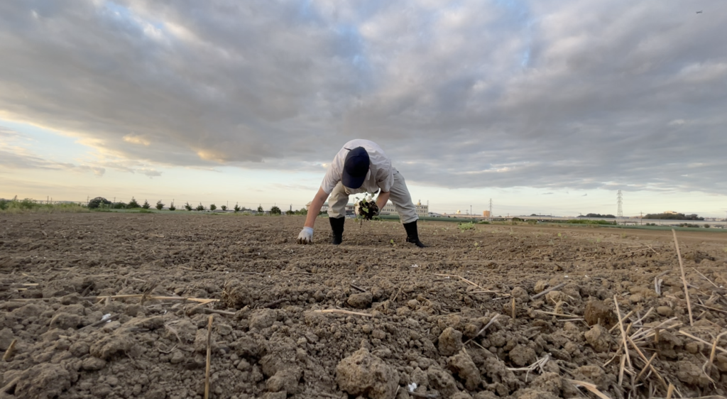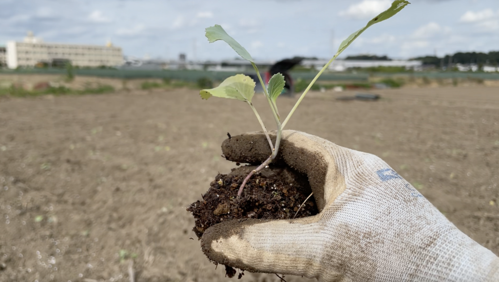 畑では、苗同士の間隔を45cmずつあけて、約1000株植えました。