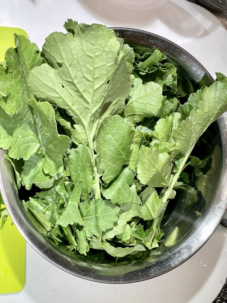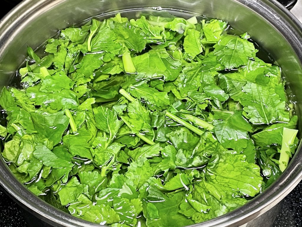 ③大根の葉を茹でる・・・まずは「茎の部分」から茹でて30秒ほどでふつふつしてくるので、続いて「葉の部分」を鍋に入れる。