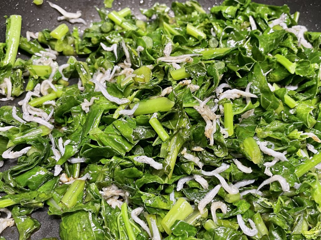 ②大根の葉のカサが減ってしんなりしたら、砂糖・しょうゆ・ちりめんじゃこを加える。